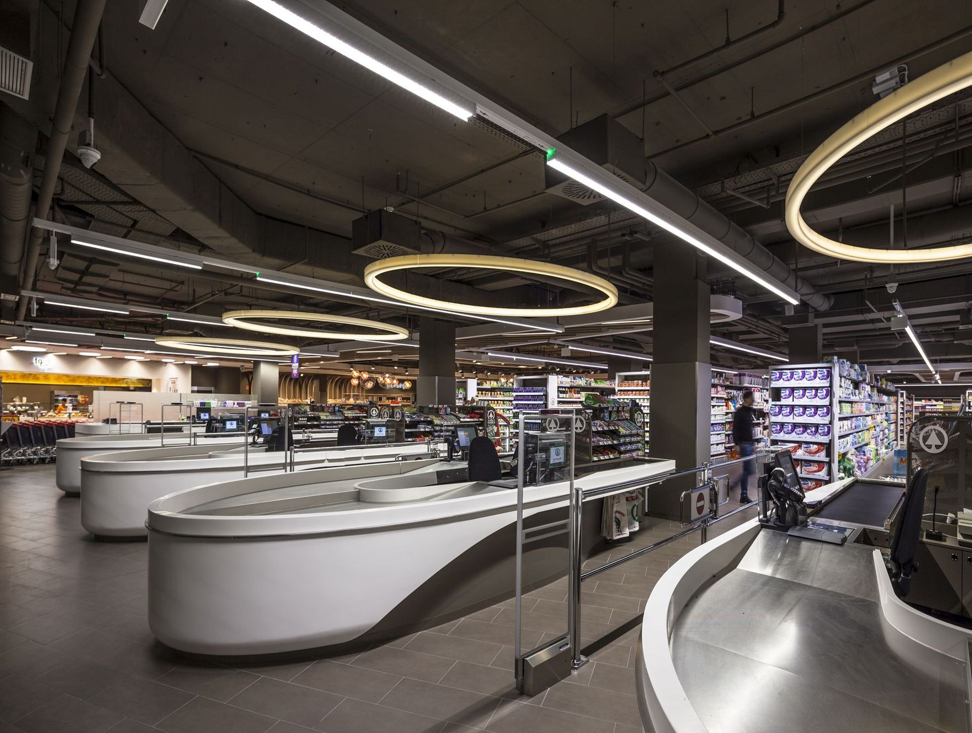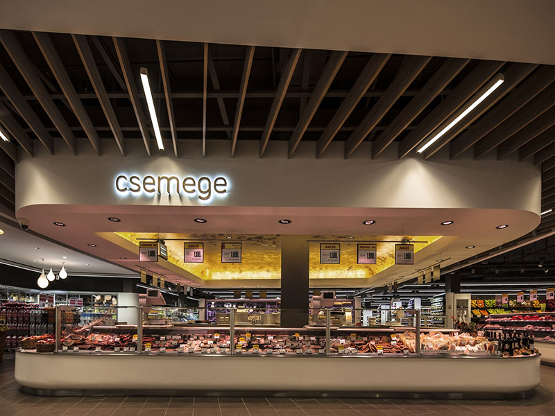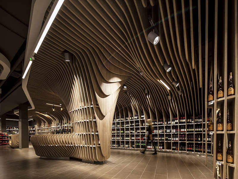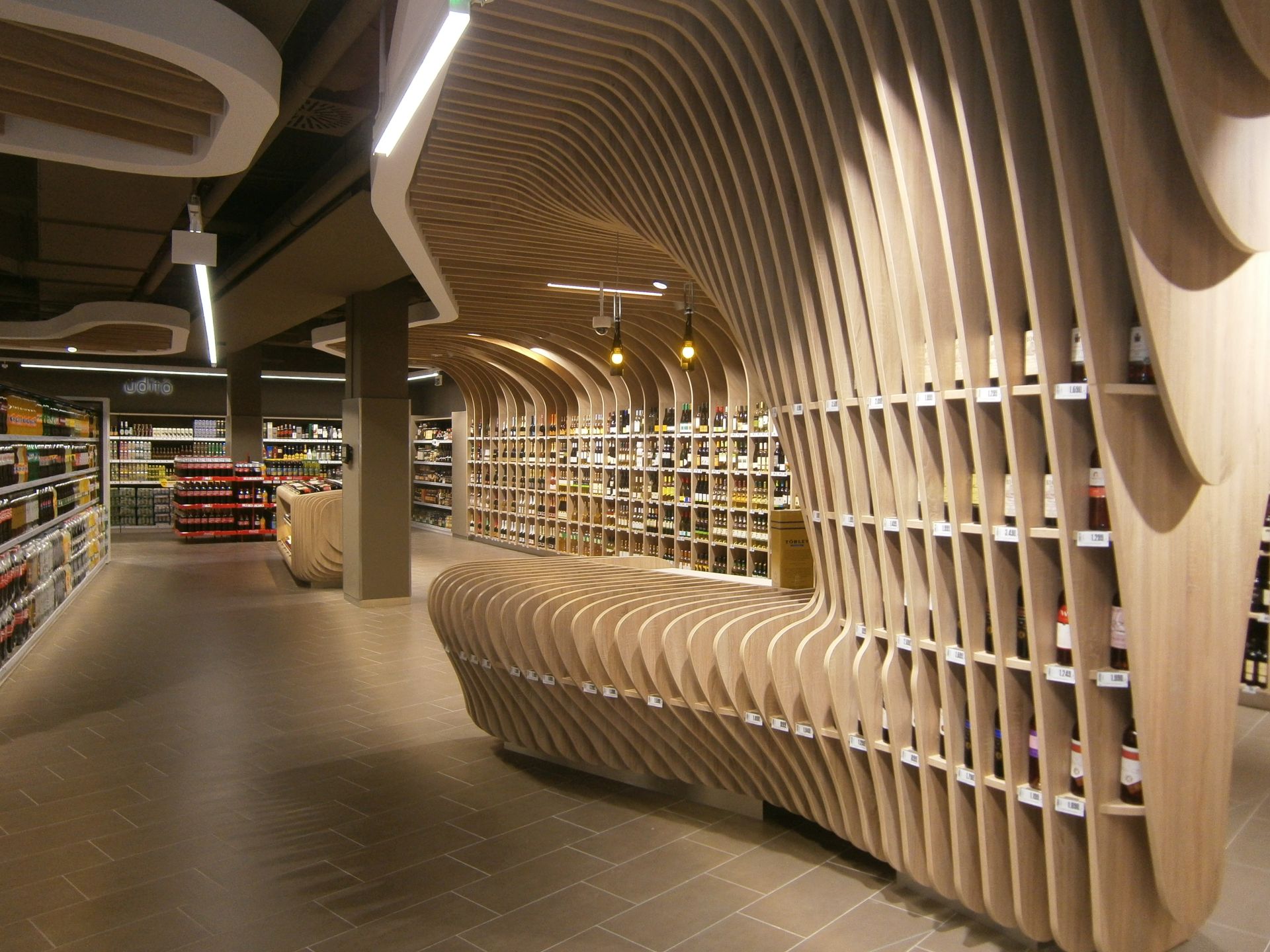 Exkluzív Spar üzlet – MOM Park bevásárló központ – 2013. szeptember A MOM park földszintjén 2013. szeptemberében nyílt meg a SPAR-nak egy új üzlete, mely Európai viszonylatban is kiemelkedik belsőépítészeti munkáit tekintve. A belsőépítészeti tervezést egy fiatal magyar csapatnak sikerült elnyerni, ők a LAB5, a kivitelezés nagy részét pedig az Enter Team valósíthatta meg. A 2000 nm-es élelmiszerüzlet teljes belső berendezése tökéletes egységet alkot. A kissé futurisztikus látványról már a hazai sajtó és több nemzetközi oldal is publikált. A legkülönegesebb egység a boros részleg, ahol a mennyezeten és a falakon is ívelő térbeli formákat úgy készítettük, hogy különböző méretű síklapokat egymás mögé helyeztünk. Ez a polcrendszer igazán különleges hangulatot ad a helyszínnek. A pénztáraknál lévő világító (glória) lámpatesteket átvilágítható Corian anyagból hajlítottuk. Tervező: LAB5 architects